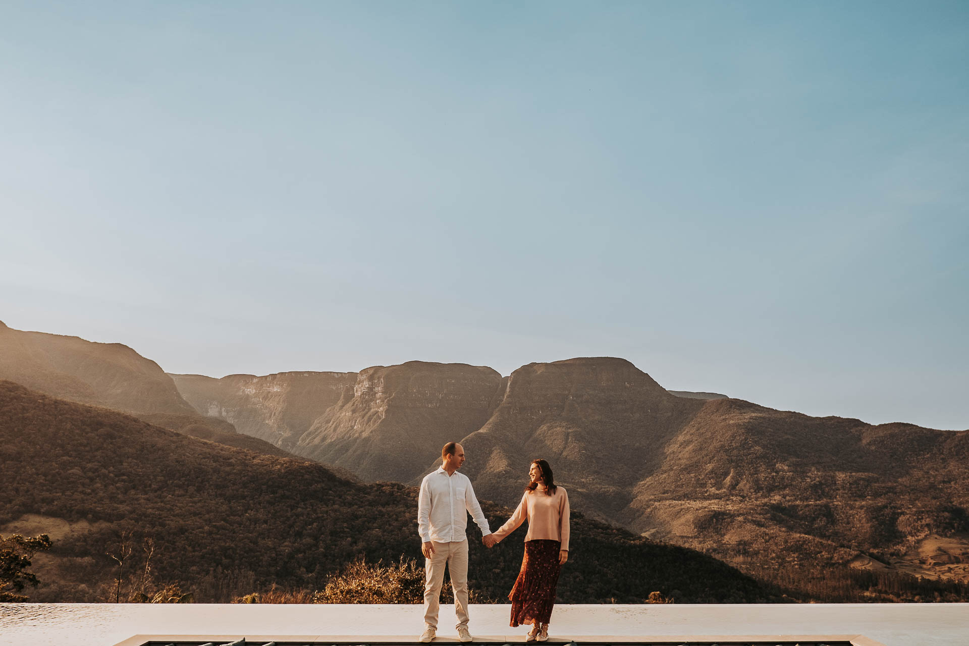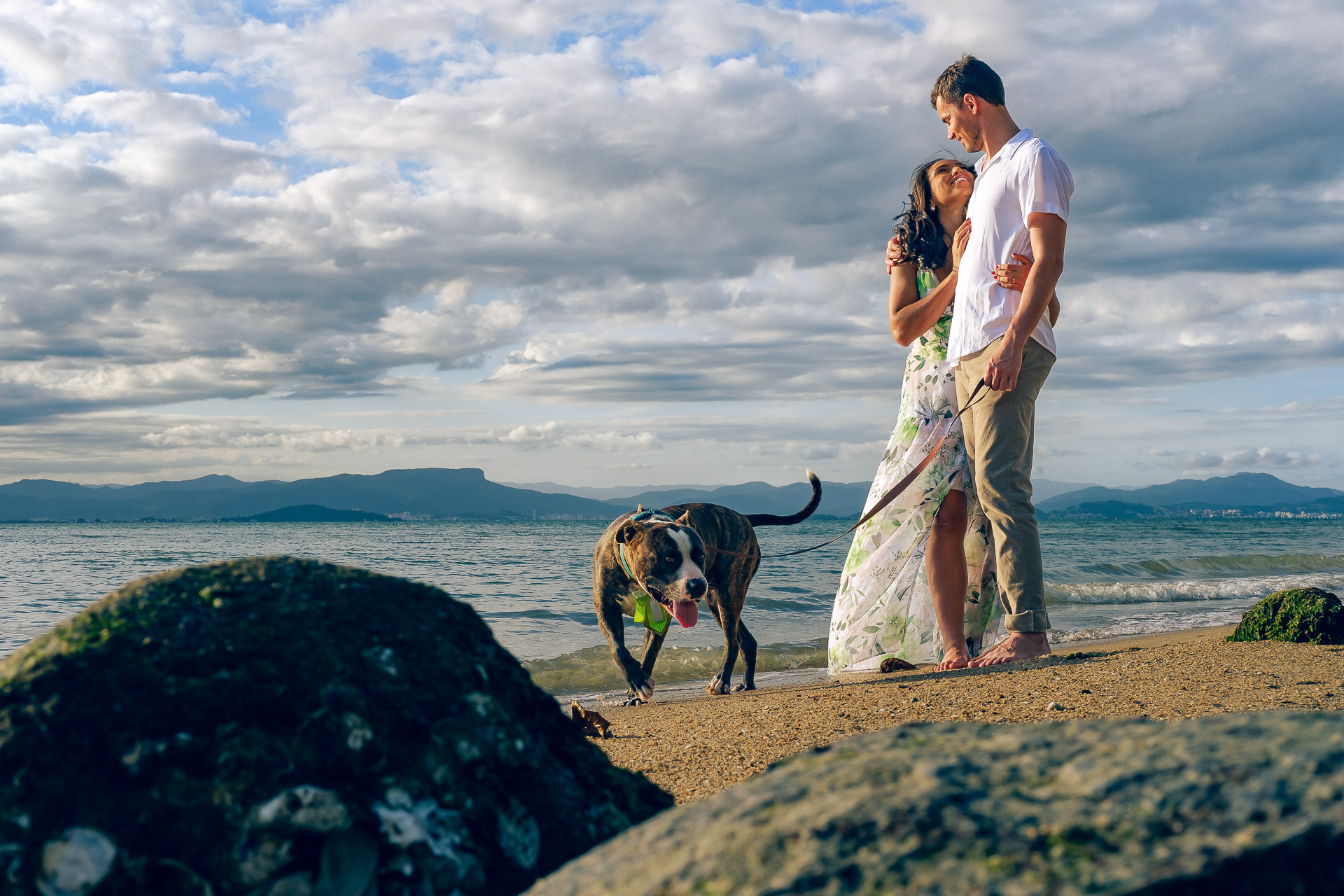 "Nunca esperava que as fotos saíssem tão maravilhosas. Pelo dia de sol, figurino e maquiagem eu já esperava que as fotos ficassem bonitas, mas jamais suspeitei que ficassem tão perfeitas. O Lauro, sua mochila, nós, a Merlot (nossa cadelinha), a paisagem de Floripa e só! Ficamos emocionados ao ver as primeiras fotos que o Lauro nos enviou, imaginei que aquelas seriam as mais lindas até receber todas as fotos e ver o trabalho impecável dele em todas as imagens! Sempre tive receio de fazer fotos por achar que elas ficariam forçadas, mas elas capturaram a nossa essência de um jeito lindo! Todos os amigos e familiares amaram as fotos, foi unânime!"