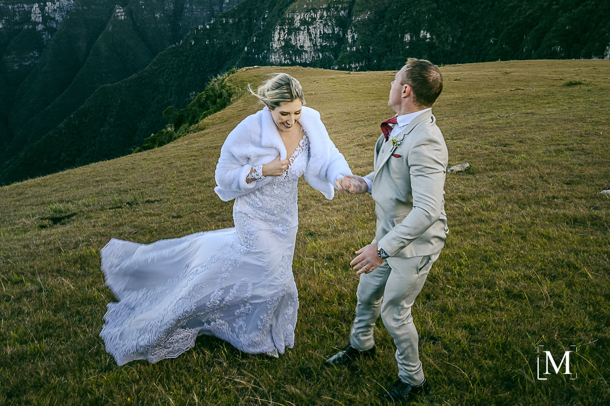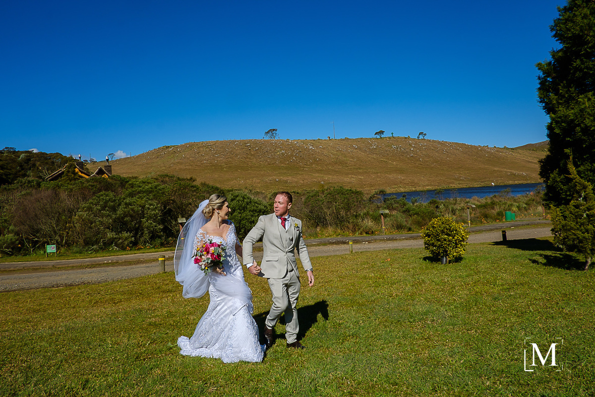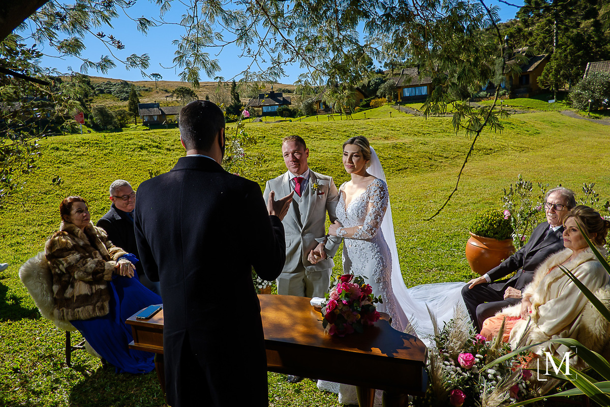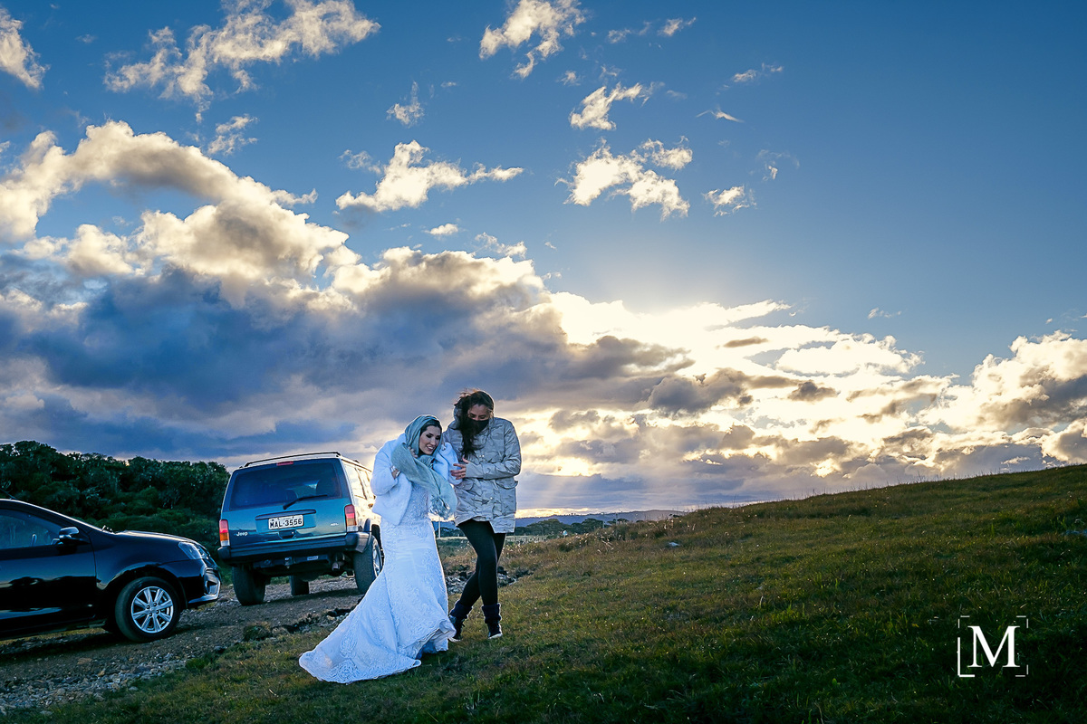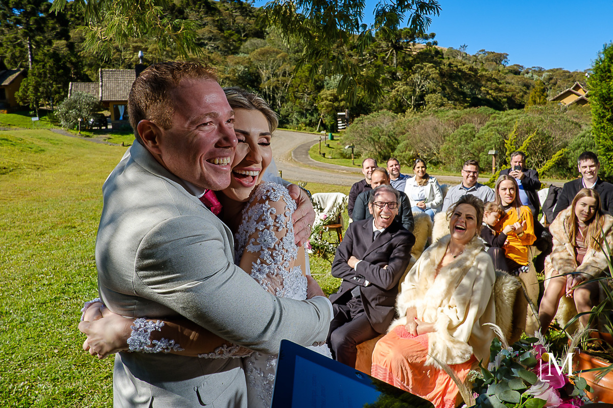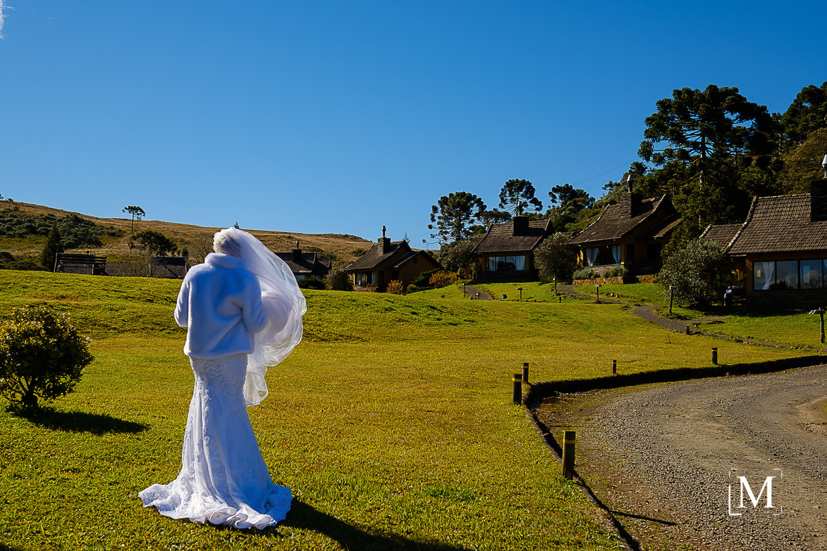 O dia amanheceu daquele jeito! Quase nenhuma certeza de que a chuva não faria uma visita, mas a esperança e a fé de todos nós deu muito certo! O sol apareceu forte, mas não ajudou muito na temperatura, que ficou ali na casa dos 10 graus... Cerimônia linda, reunindo apenas familiares e amigos íntimos, foi no local que o vento permitiu. Protegida por uma parede de árvores, o Raphael Faraco conduziu a celebração da troca de alianças. Aguardamos um tempo com a esperança da temperatura subir um pouco, mas foi em vão. Decidimos, então, subir no "topo" do Resort para fazermos algumas fotos do casal. O frio lá em cima era tanto que não aguentamos mais do que 10 minutos fora dos carros. As expressões dos noivos dizem tudo!