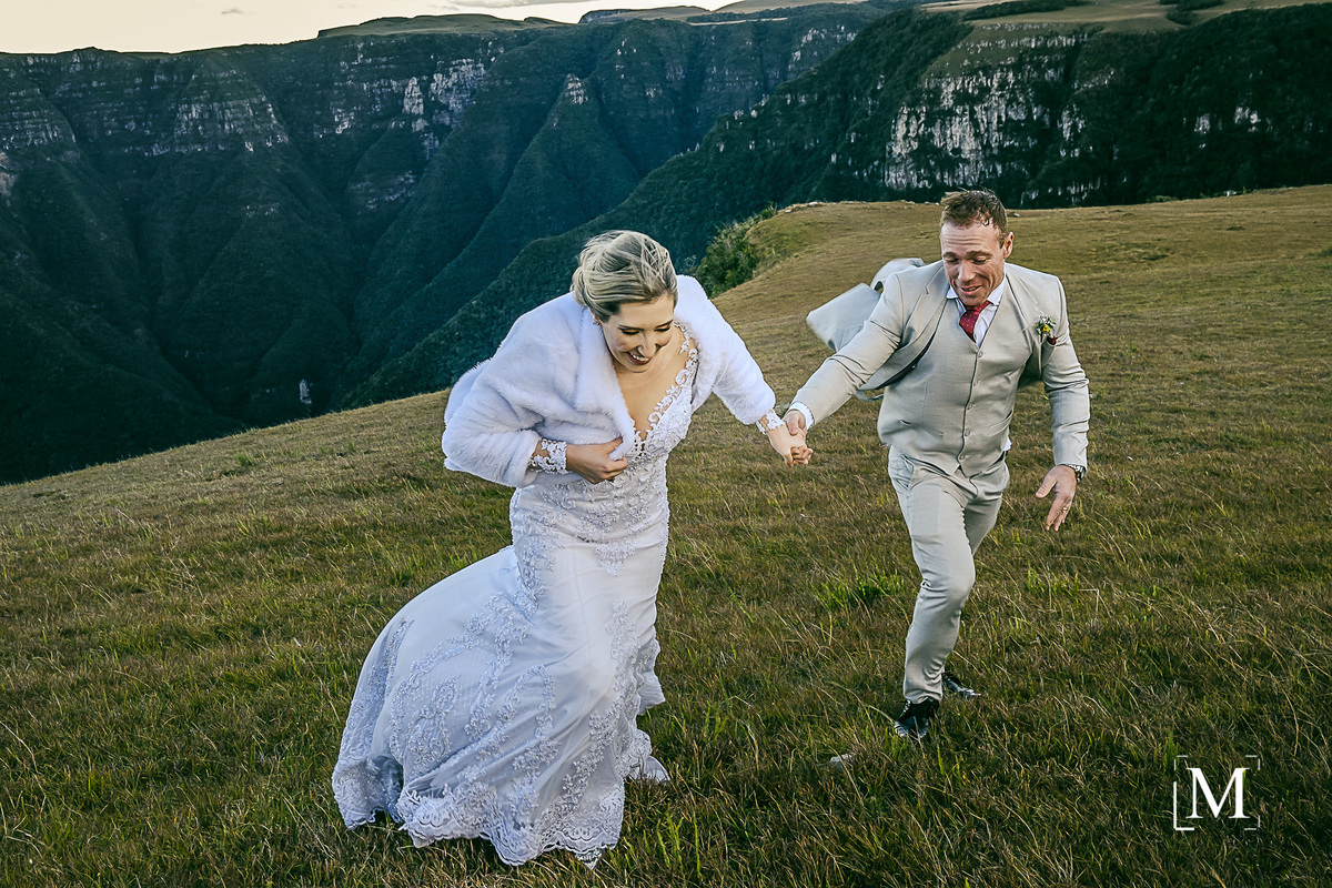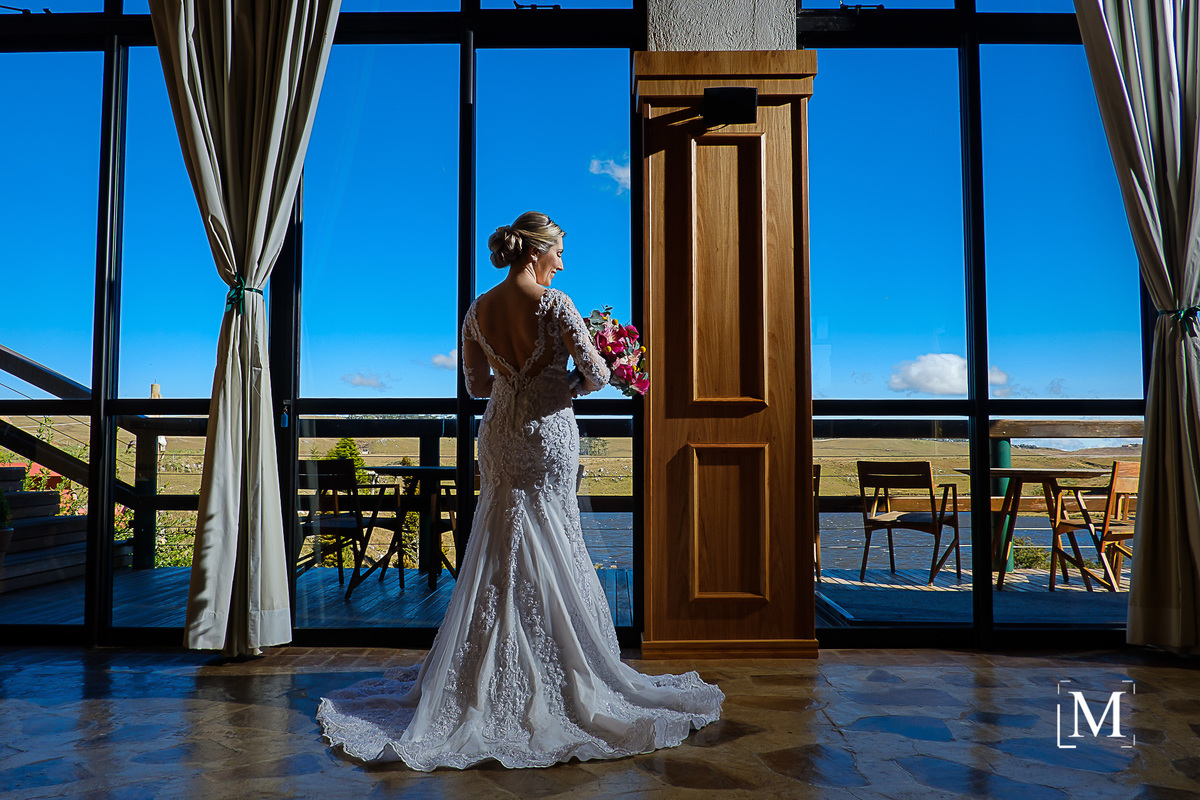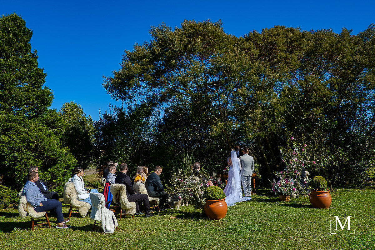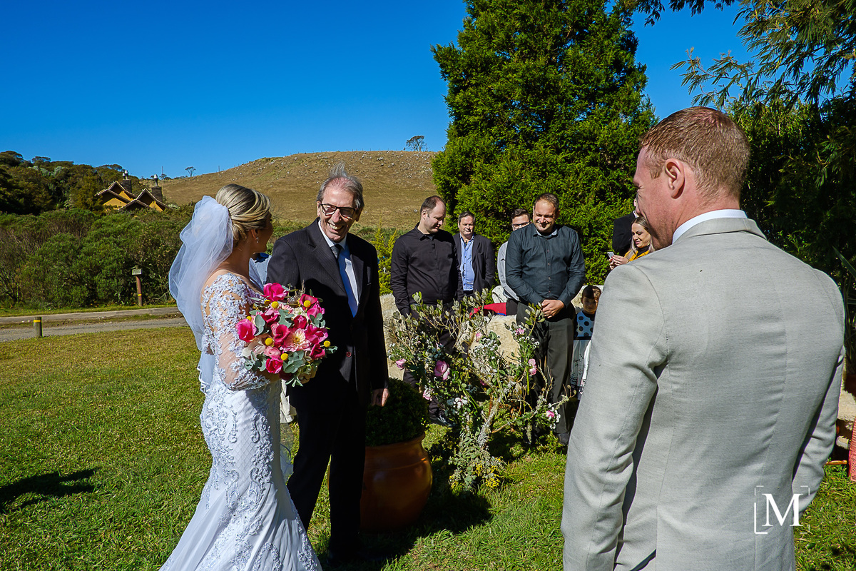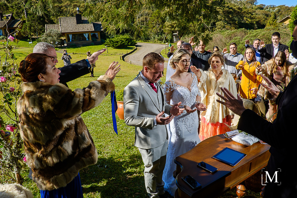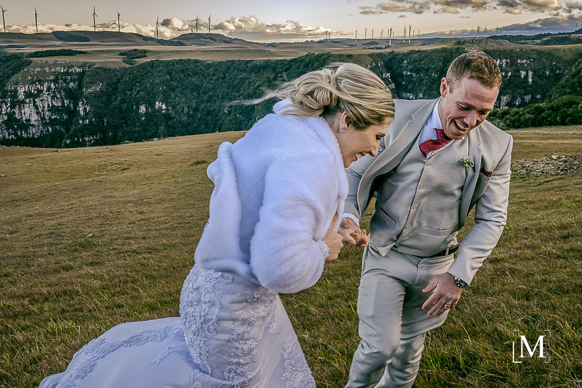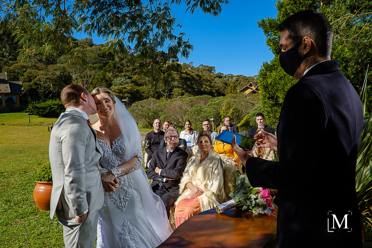 O dia amanheceu daquele jeito! Quase nenhuma certeza de que a chuva não faria uma visita, mas a esperança e a fé de todos nós deu muito certo! O sol apareceu forte, mas não ajudou muito na temperatura, que ficou ali na casa dos 10 graus... Cerimônia linda, reunindo apenas familiares e amigos íntimos, foi no local que o vento permitiu. Protegida por uma parede de árvores, o Raphael Faraco conduziu a celebração da troca de alianças. Aguardamos um tempo com a esperança da temperatura subir um pouco, mas foi em vão. Decidimos, então, subir no "topo" do Resort para fazermos algumas fotos do casal. O frio lá em cima era tanto que não aguentamos mais do que 10 minutos fora dos carros. As expressões dos noivos dizem tudo!