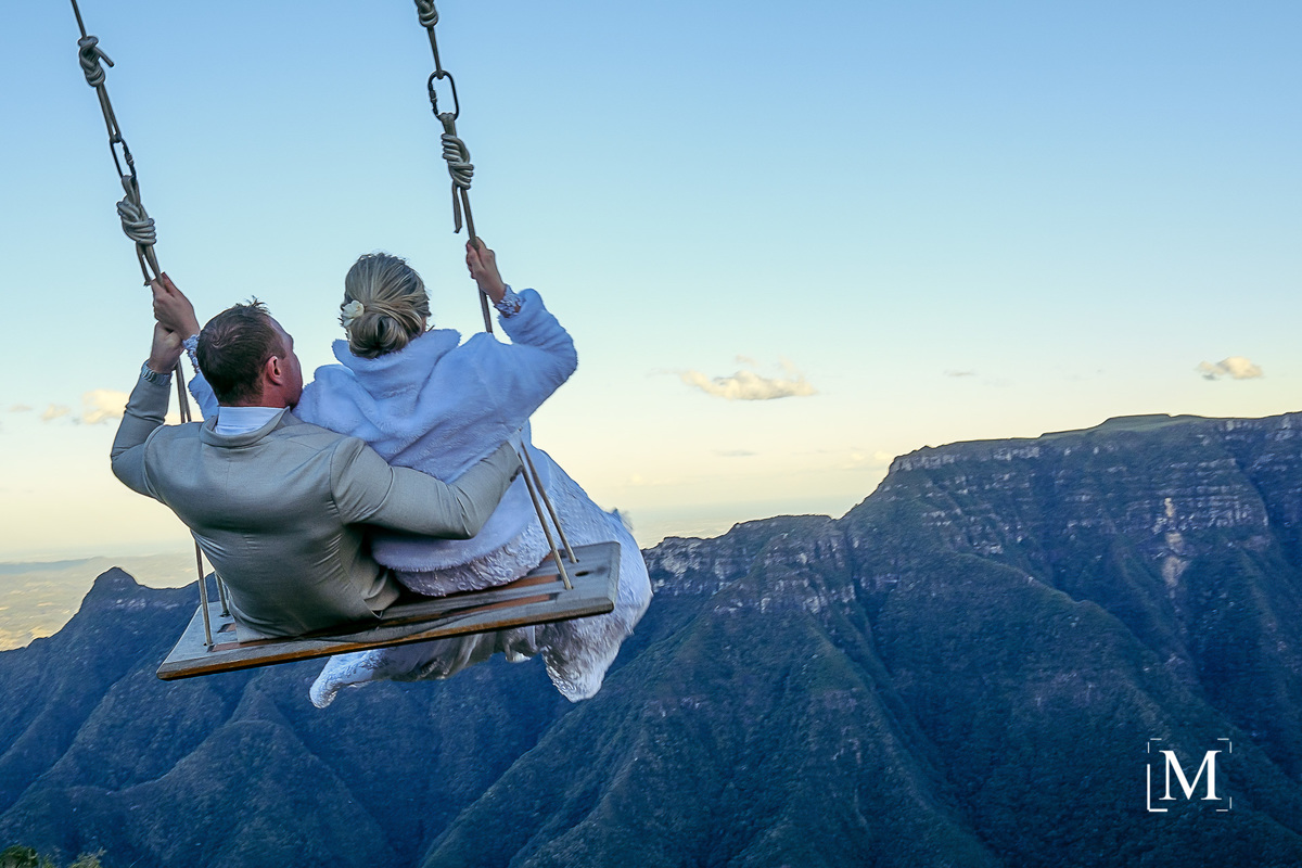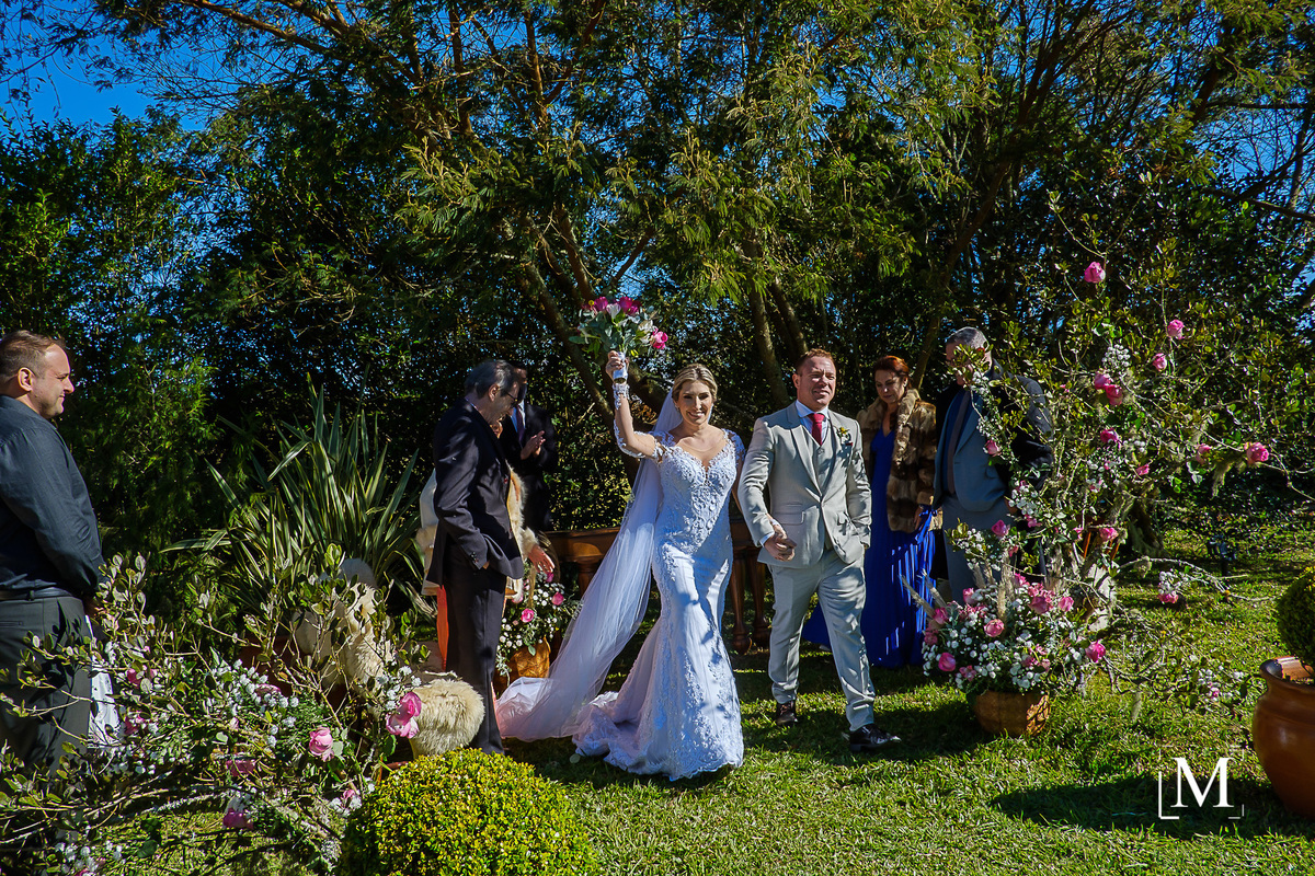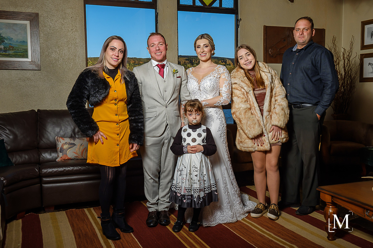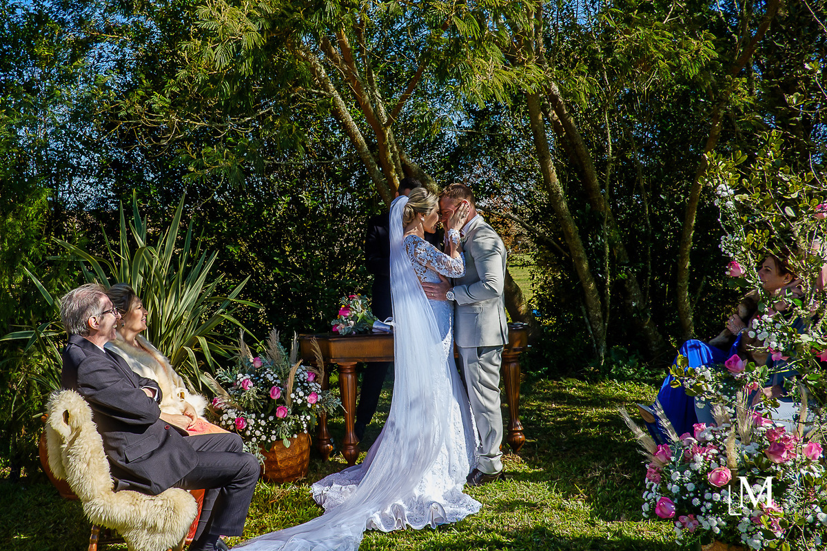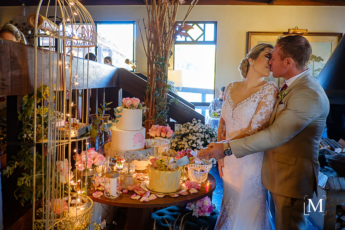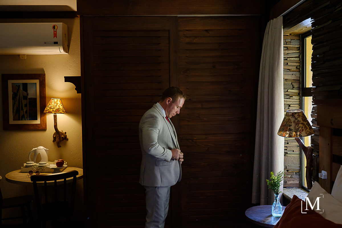 O dia amanheceu daquele jeito! Quase nenhuma certeza de que a chuva não faria uma visita, mas a esperança e a fé de todos nós deu muito certo! O sol apareceu forte, mas não ajudou muito na temperatura, que ficou ali na casa dos 10 graus... Cerimônia linda, reunindo apenas familiares e amigos íntimos, foi no local que o vento permitiu. Protegida por uma parede de árvores, o Raphael Faraco conduziu a celebração da troca de alianças. Aguardamos um tempo com a esperança da temperatura subir um pouco, mas foi em vão. Decidimos, então, subir no "topo" do Resort para fazermos algumas fotos do casal. O frio lá em cima era tanto que não aguentamos mais do que 10 minutos fora dos carros. As expressões dos noivos dizem tudo!