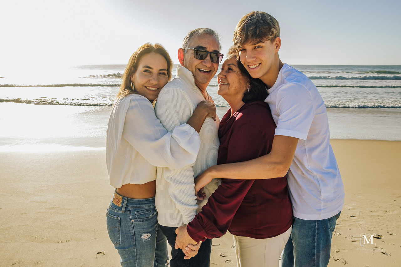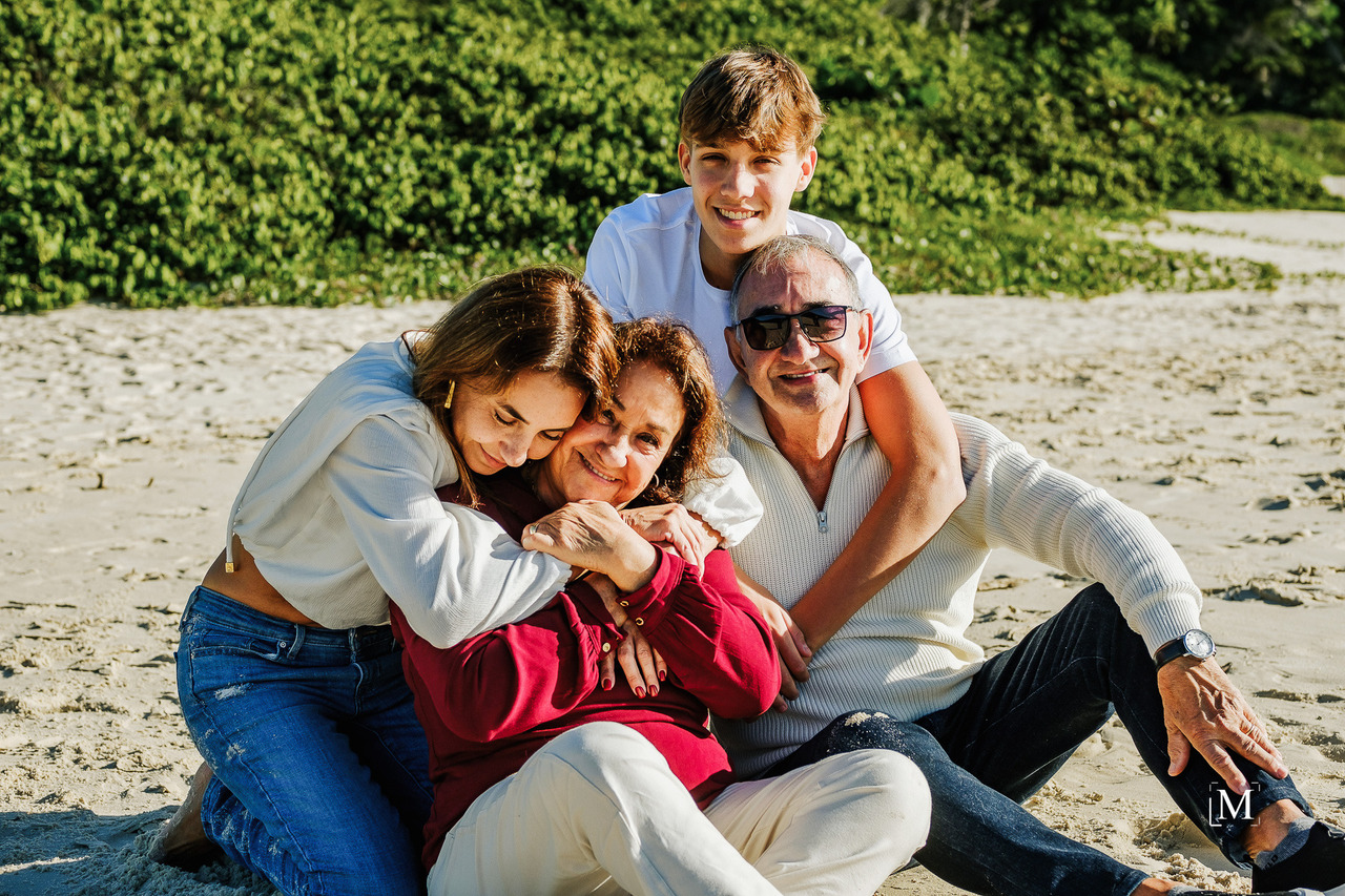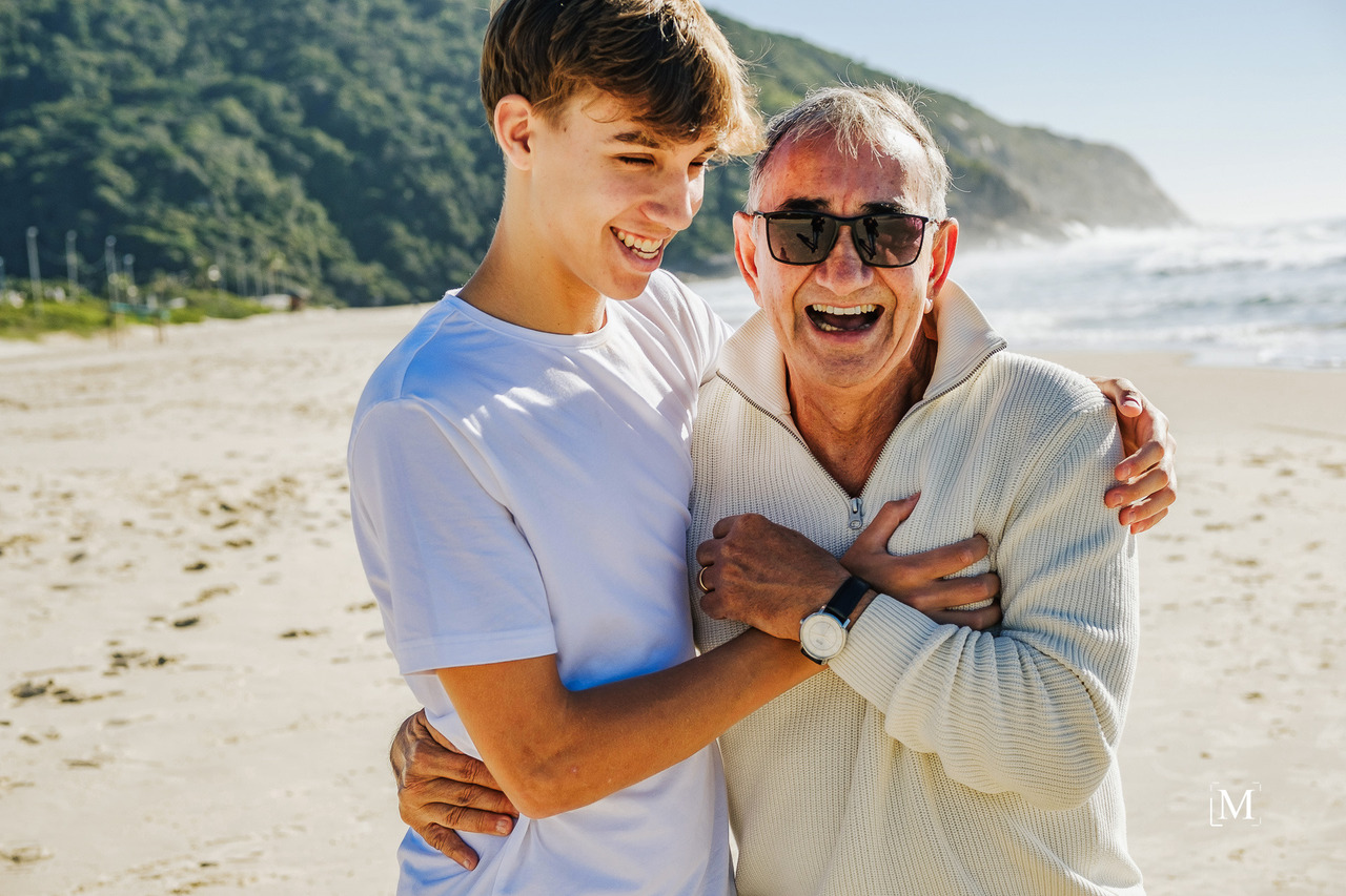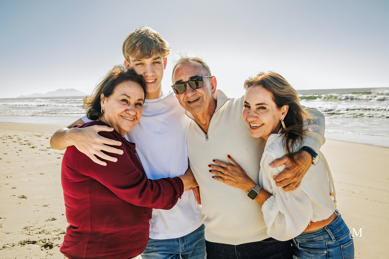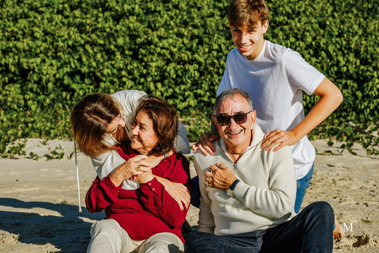 Imagine uma manhã perfeita na praia: o som das ondas, o brilho do sol e o vento suave tocando os rostos de três gerações reunidas. Uma mãe, seu filho e os avós, unidos pelo laço mais poderoso de todos: o amor. Cada sorriso, cada abraço e cada olhar contam uma história única de carinho, respeito e conexão familiar.